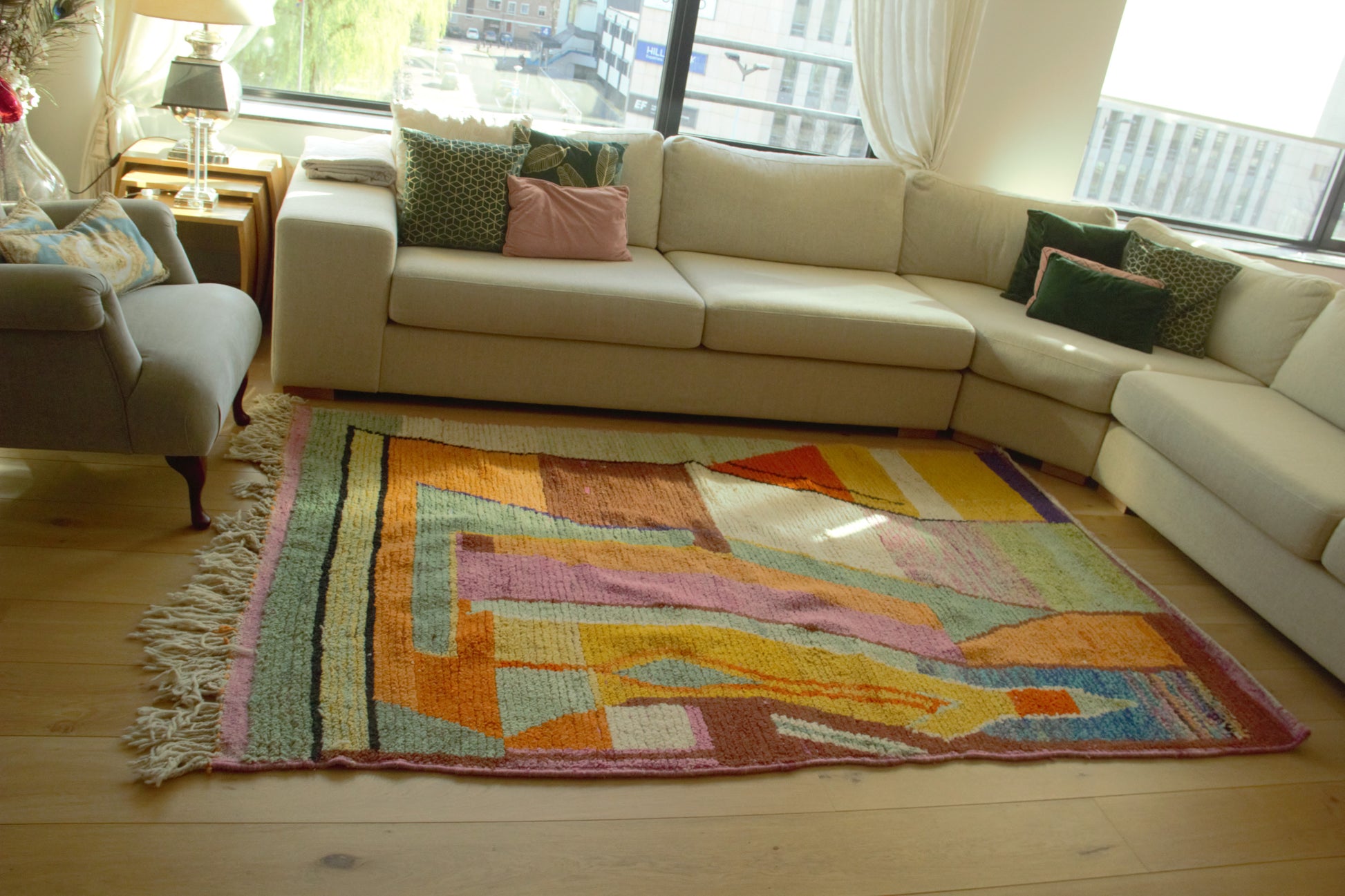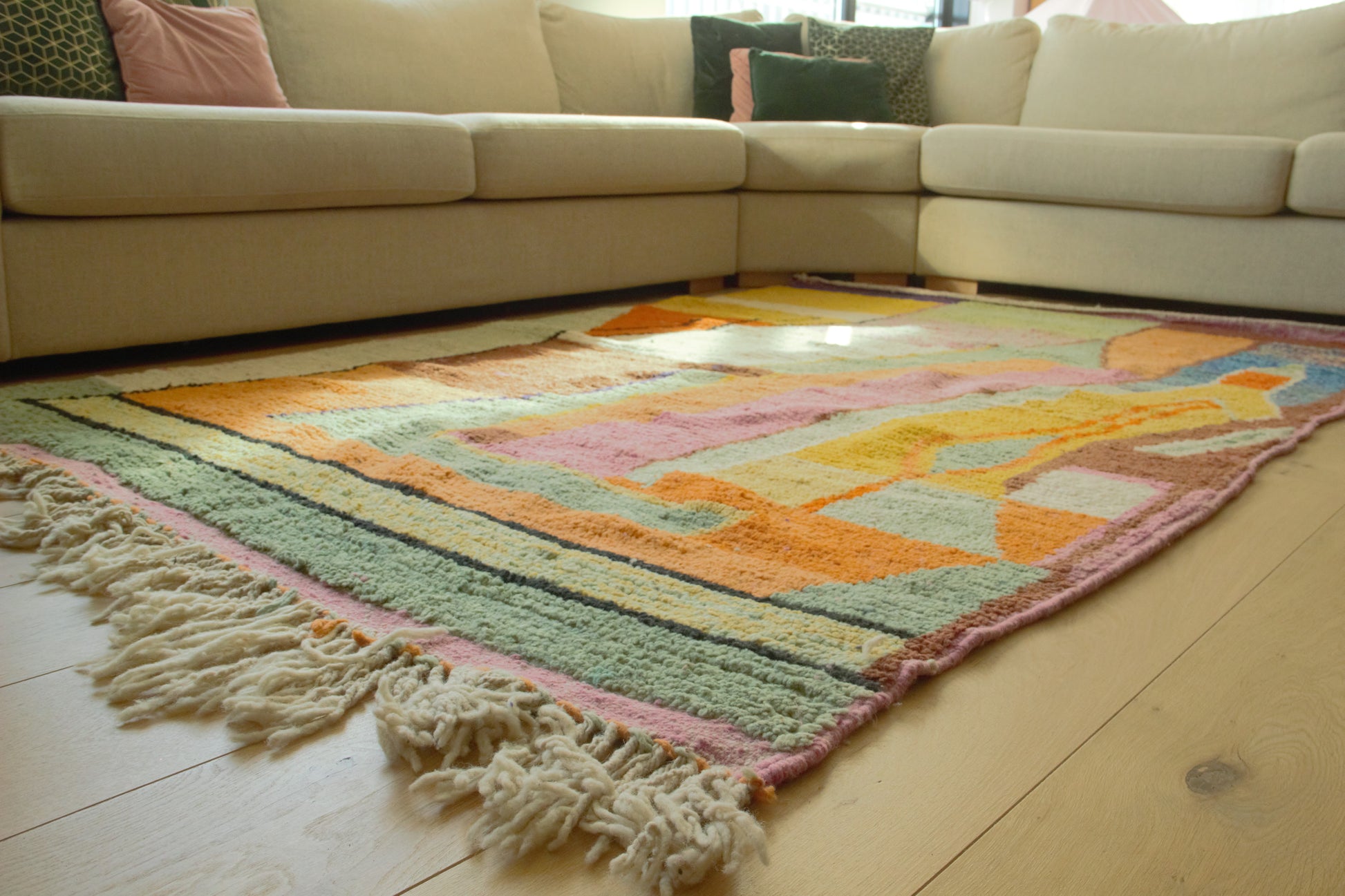 Rihana is met de hand geweven in Fes, Marokko, volgens eeuwenoude Berberse technieken die generaties lang zijn doorgegeven. Elk detail is met zorg vervaardigd, met aandacht voor kleur, patroon en materiaal. Het dikke, zachte wol voelt luxueus aan en zorgt voor comfort en sfeer.
