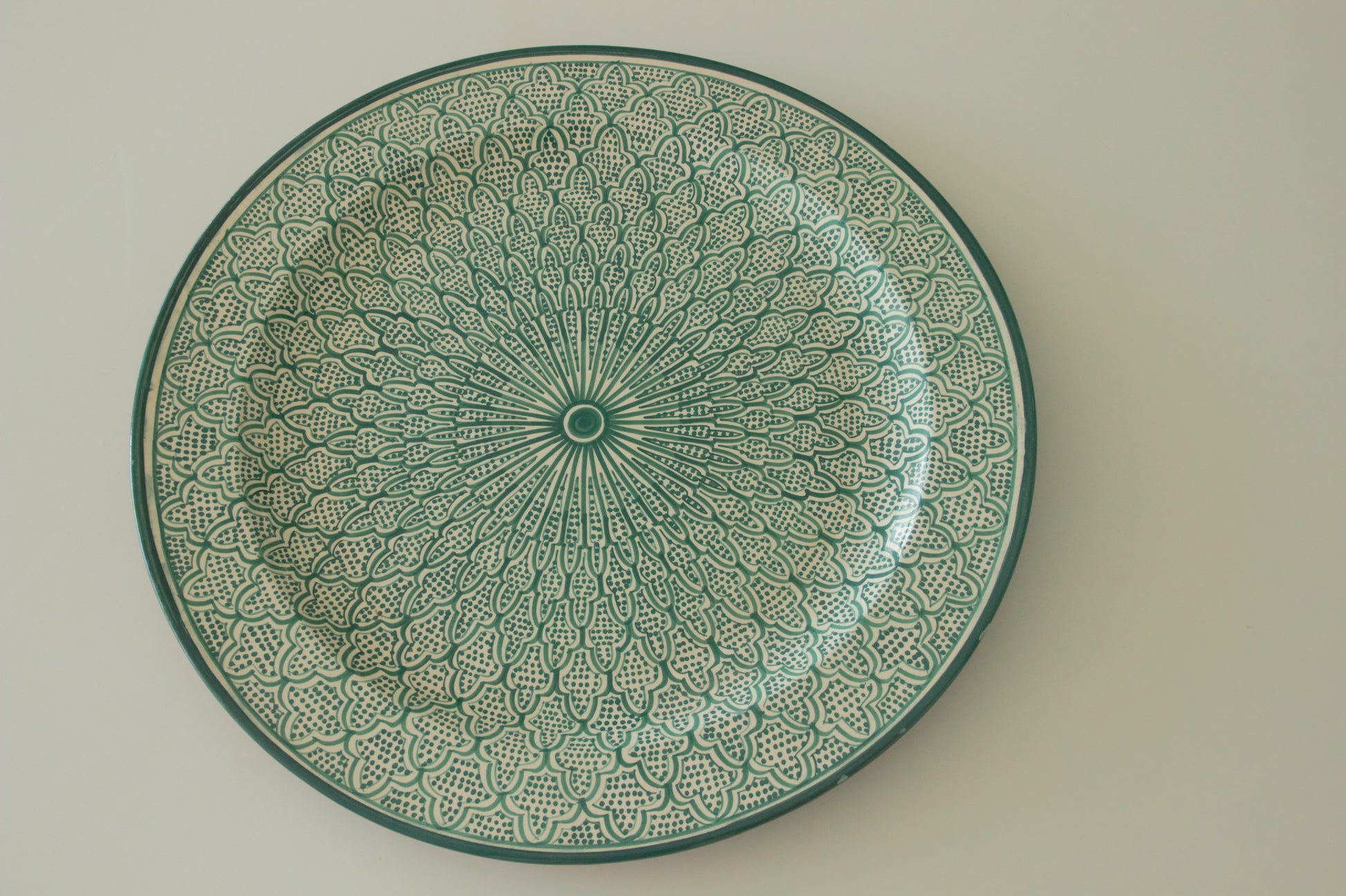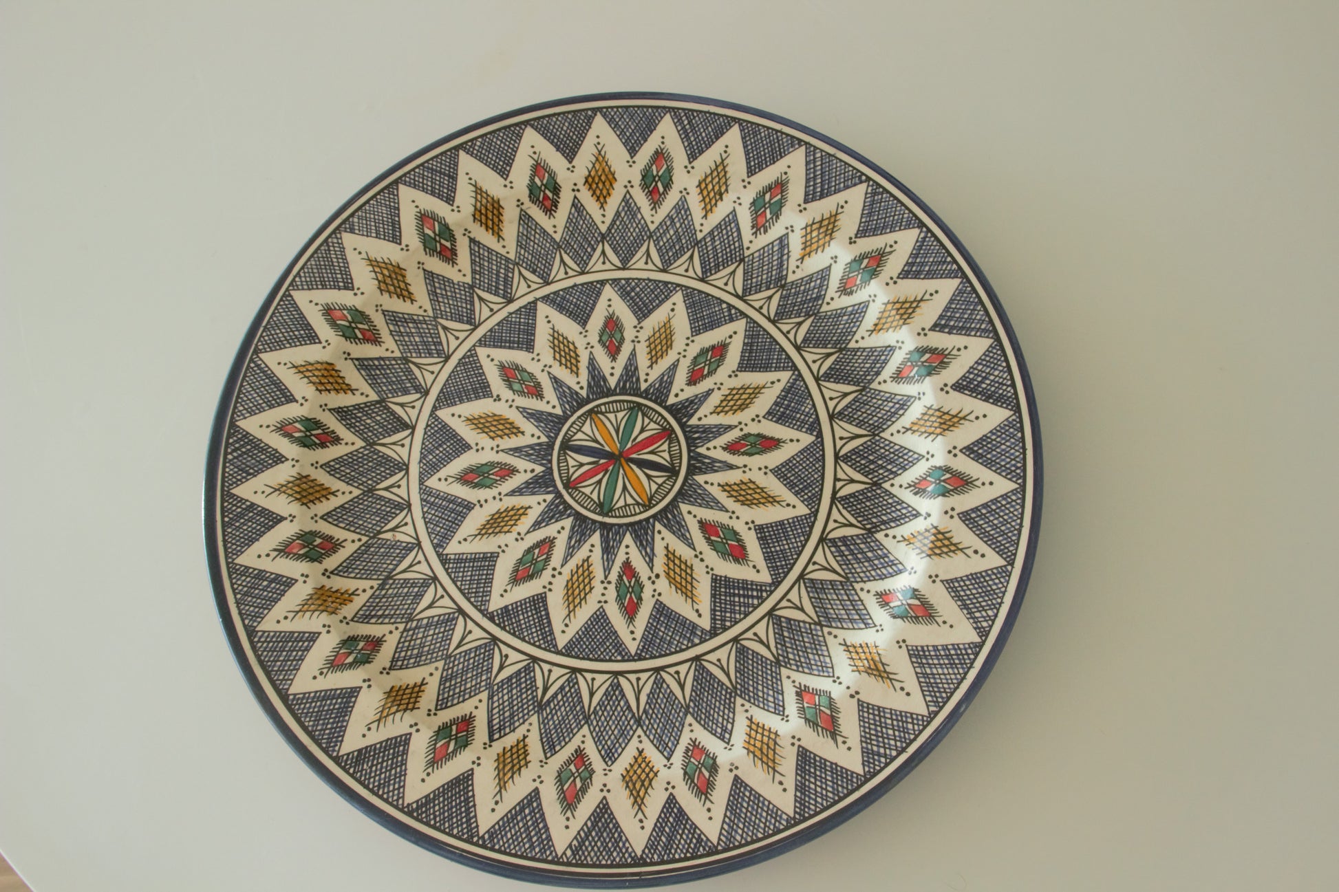 Kenza is een met de hand gemaakte Marokkaanse schaal die met haar symmetrische patroon rust, verfijning en stijl uitstraalt. Het geometrische ontwerp straalt vanuit het midden als een bloem of ster en brengt een harmonieuze balans op tafel of aan de muur.