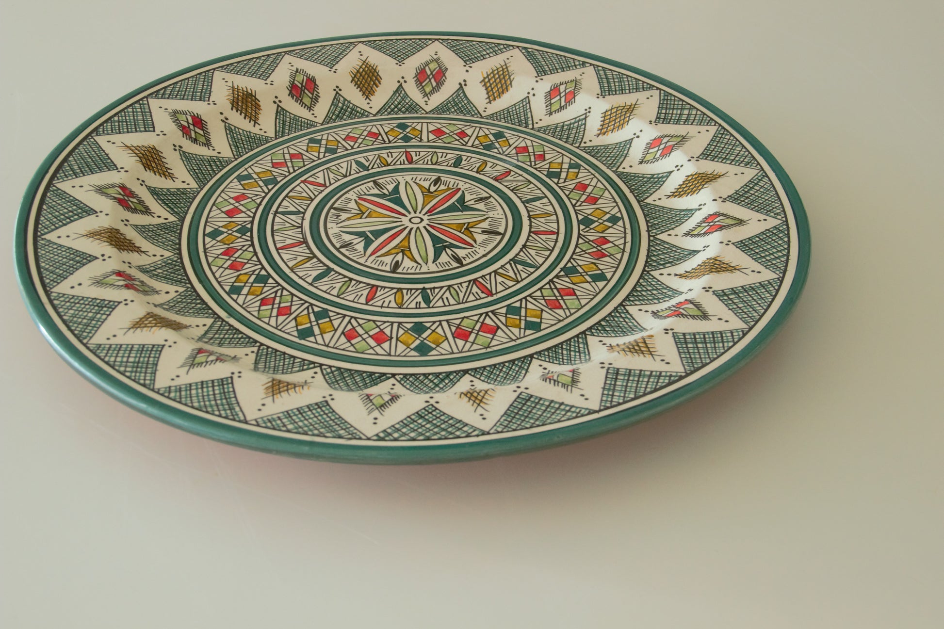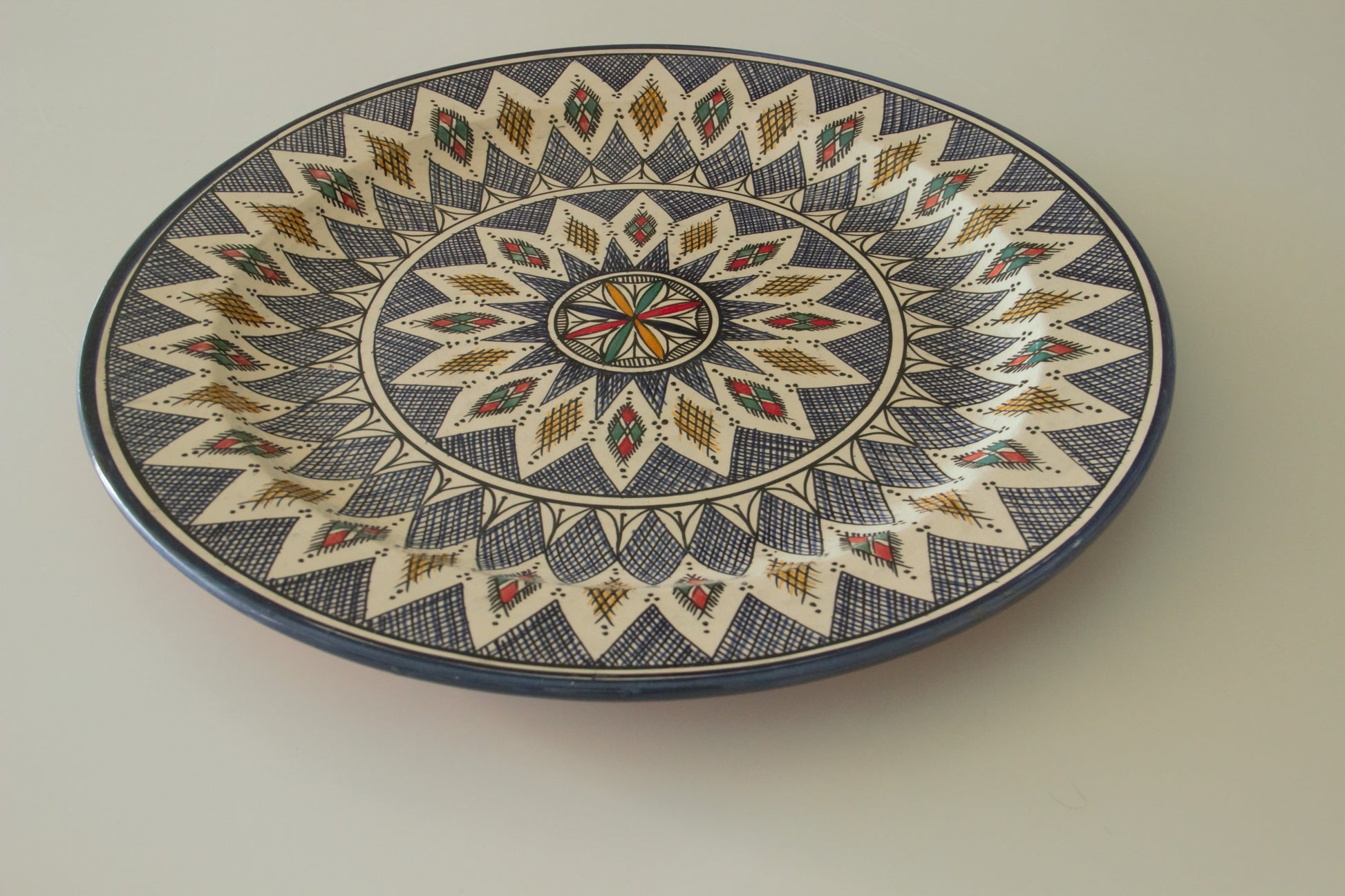 Elke schaal is met de hand geglazuurd en gedecoreerd door ambachtslieden in Marokko. Het subtiele lijnenspel en de verfijnde details weerspiegelen een eeuwenoude traditie van precisie en artistieke expressie. Of je haar gebruikt om gerechten te serveren of als wanddecoratie – Kenza maakt van elke ruimte iets bijzonders.