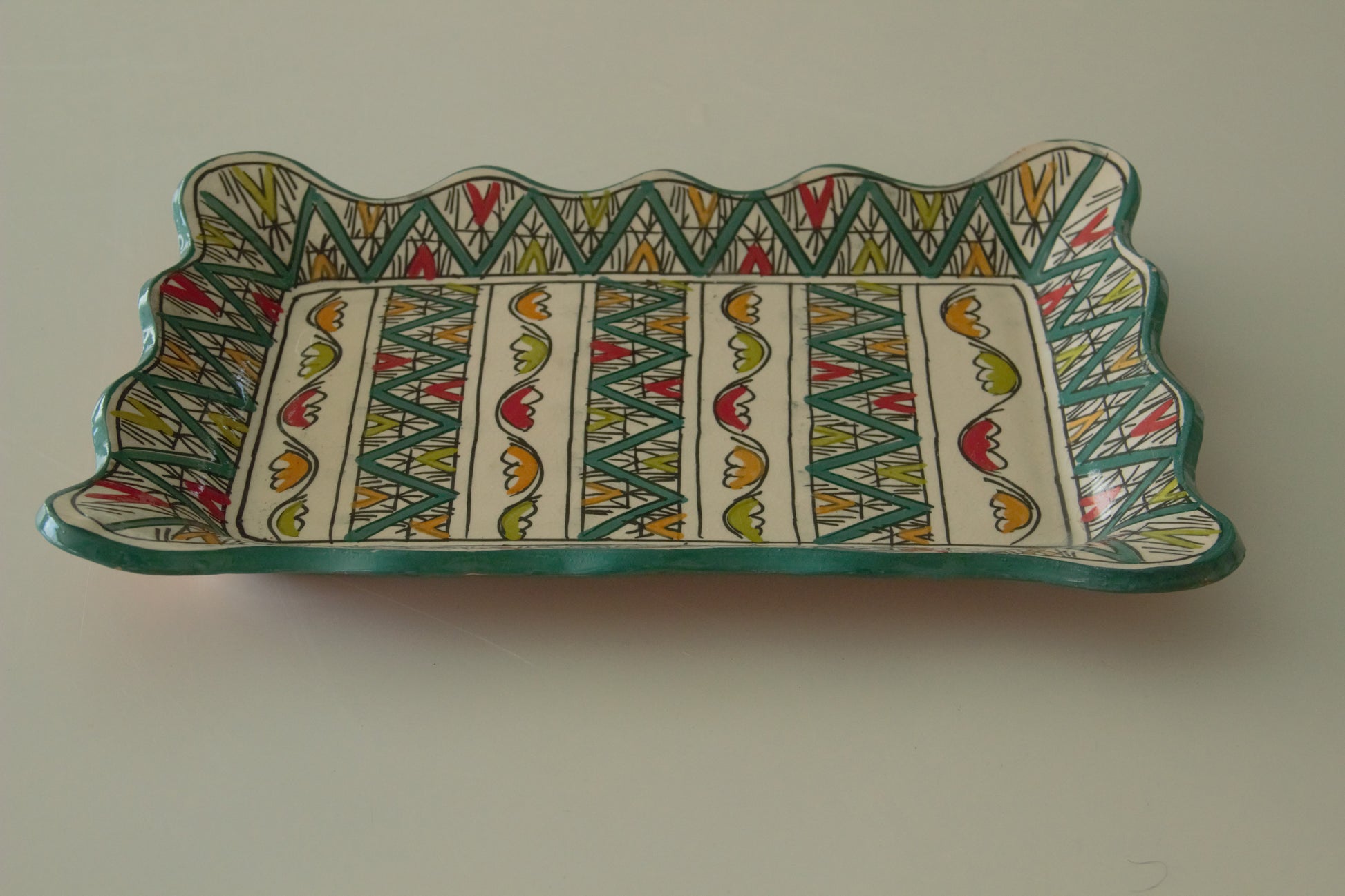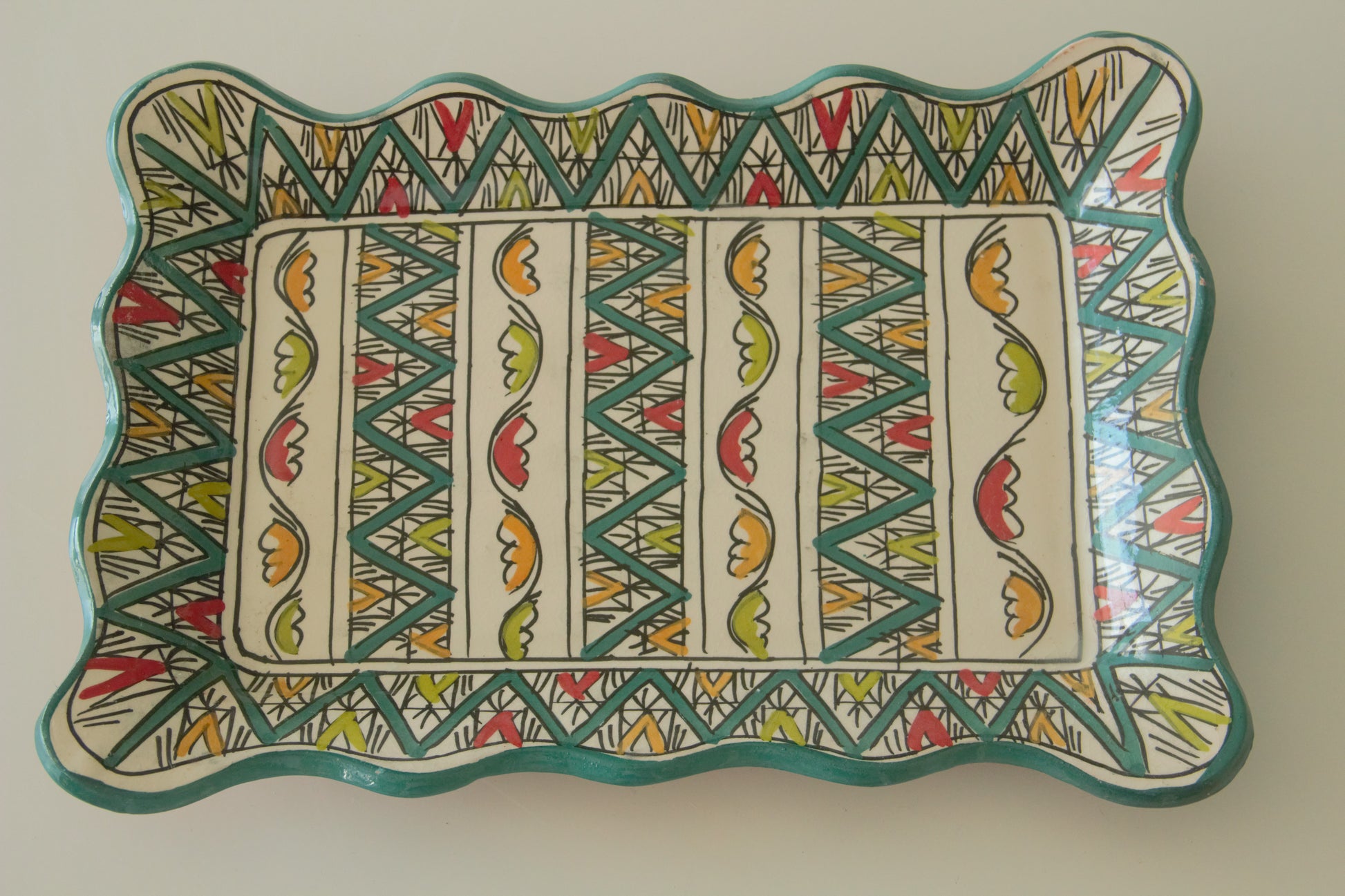 Deze schaal is met de hand gevormd en beschilderd door ambachtslieden in Marokko. De kleuren zijn levendig, de lijnen spontaan en de vorm speels golvend – elke Tazla is uniek en vertelt haar eigen verhaal van traditie en creativiteit.