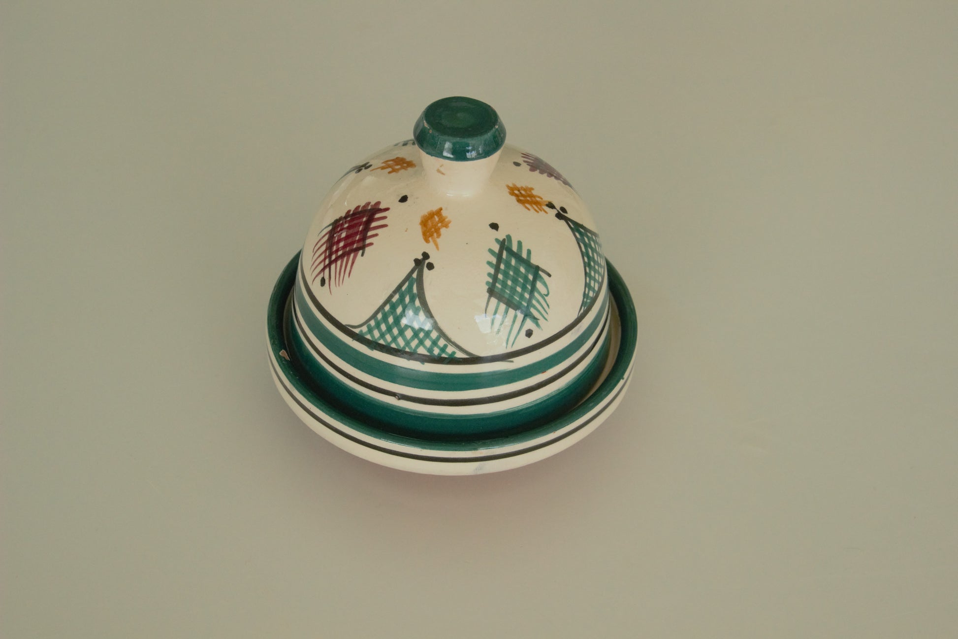 Elke tajine in deze set is uniek. De patronen en kleuren zijn met de hand aangebracht door lokale vakmensen in Marokko, waardoor elk item zijn eigen karakter heeft. Van olijven en amandelen tot harissa of tapenade – deze mini tajines zorgen voor een verfijnde presentatie met een verhaal.